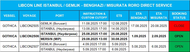 LIBCON2506 Seferimize Mersin uğrağı eklenmiştir, esnek çalışma prensibiyle işletilen hattımızda proje yükler olması durumunda gemi programında aksaklıklara sebebiyet vermeden değişiklikler yapılabilmektedir.