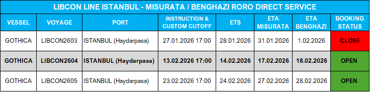 LIBCON2607 Seferimize yolcu kabulu başlamıştır, esnek çalışma prensibiyle işletilen hattımızda proje yükler olması durumunda gemi programında aksaklıklara sebebiyet vermeden değişiklikler yapılabilmektedir.