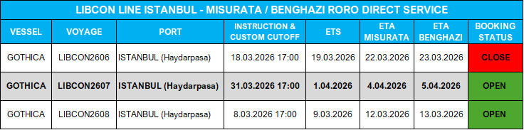 LIBCON2607 Seferimize yolcu kabulu başlamıştır, esnek çalışma prensibiyle işletilen hattımızda proje yükler olması durumunda gemi programında aksaklıklara sebebiyet vermeden değişiklikler yapılabilmektedir.